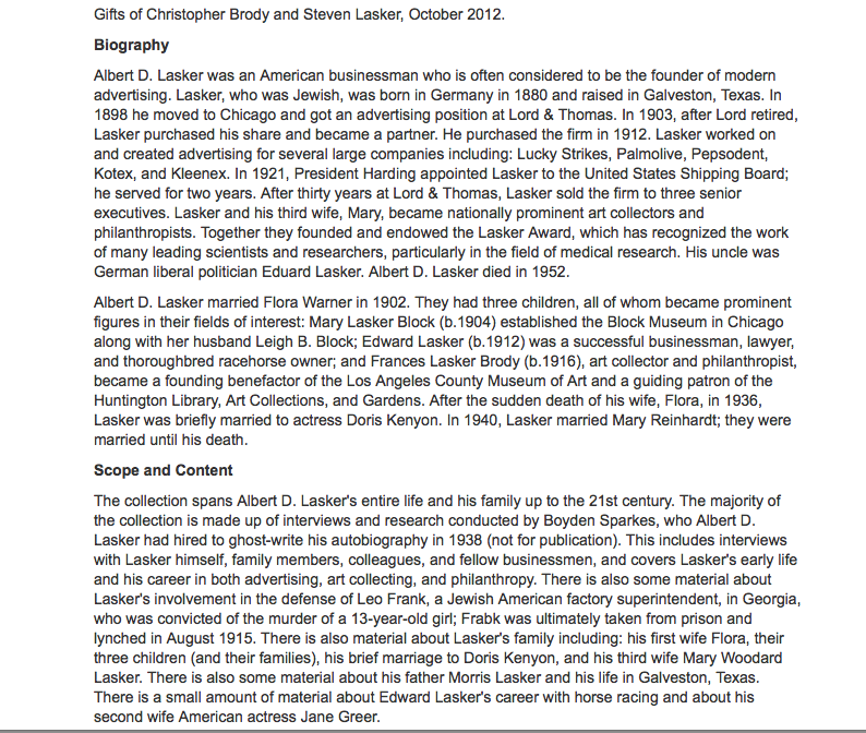 Albert D. Lasker Papers MSS descr. found at OnlineArchiveCalifornia, as held at Huntington Library in San Marino Calif. More bio details and relatives named; noticed date of acquisition and source. Click image to enlarge.