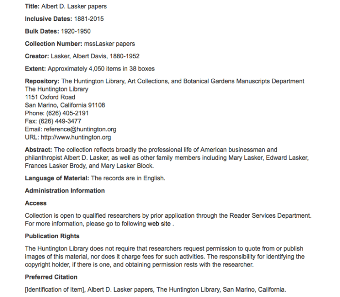 Albert D. Lasker Papers MSS descr. found at OnlineArchiveCalifornia, as held at Huntington Library in San Marino Calif. More bio details and relatives named; noticed date of acquisition and source. Click image to enlarge.