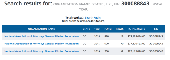 While I’m on that topic, since NAAG actually does have (control) a 501©3 of similar name (shown below), the “NAAG Mission Foundation, Inc.,” then why not at least post ITS financials on the NAAG website? There’s at least a drop-down menu listing for the Mission Foundation, why not some nice 990s? Or consolidated financial statements for them both?