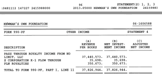 Yes I am aware he died in 2008. May discuss later on a post featuring this new page: The current foundation’s wealth comes directly from Paul Newman (originally, first return FY2004) in the form of “partnership interests” and, strangely, the Foundation controls (holds 99% and 100%, respectively) several partnerships and the C-Corp Newman’s Own, Inc. Income is flowing through from them.