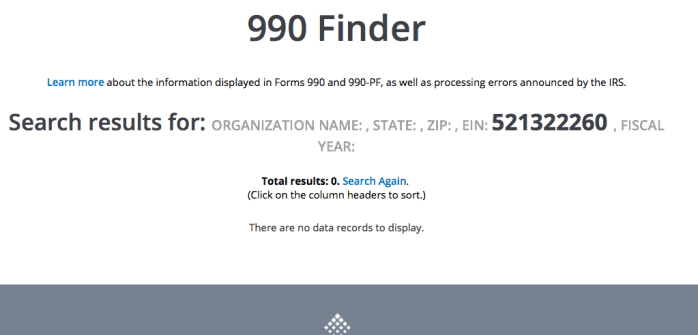 Just one of several places I tried to dredge up a tax return — or anything! — for the NAAG EIN# as proffered to the public on NAAG Mission Foundation Form 990s over time. This pattern mimics, I believe, the relationship between the NGA (National Governors’ Association) and its “NGA Center for Best Practices” with some differences — other places continue to characterize this NAAG EIN# as belonging to a “PC” (public charity — the kind that has to file!).