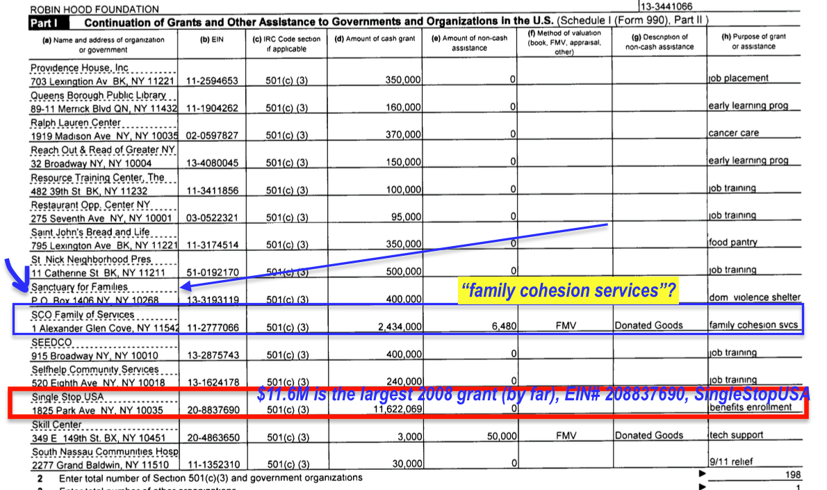 RH Fndtn EIN#133441066) FY2008 (<==link to the entire return) (YE Dec) — Reports $11M to a 2007-formed SingleStopUSA entity, which only acknowledged receiving $8M the same year (also YE Dec). SingleStop went from “0 to 60” for grants in a single year, and has a disregarded entity (software) for signing up people for as many government benefits as possible, efficiently, in multiple states (Tax, Benefits, Healthcare, Legal counseling) and admits (FY2008 Form 990) to having taken over RHF’s NY sites for this purpose.