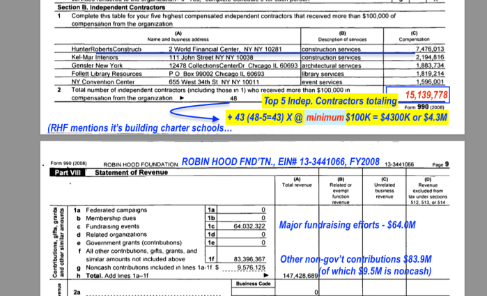 IRS Form 990 doesn’t require listing of excess subcontractors by name, type of service and amounts paid after the first 5. Here (RHF FY2008), that meant over ⅞ of the subcontractors claimed were NOT named. Nor does it show an average amount, or the total amount — although this form easily could’ve prompted for this information. Therefore — if it doesn’t show, who’s to know? whether the figures are always genuine?