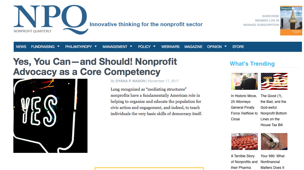 (Click image to enlarge for article abstract or intro as shown). This dates to 11/17/2017 and is seen on “nonprofitquarterly.org” home page: Lead-in text is: …Long recognized as “mediating structures” nonprofits have a fundamentally American role in helping to organize and educate the population for civic action and engagement, and indeed, to teach individuals the very basic skills of democracy itself.”