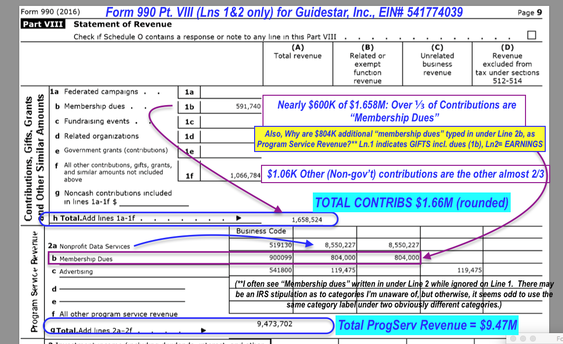 GUIDESTAR 990, FY2016, Pg.9 Top (Lns 1+2 only) = Pt. VIII showing primary source of revenues (compare also to Pt I Page 1, Summary) (#4 of 4 images)