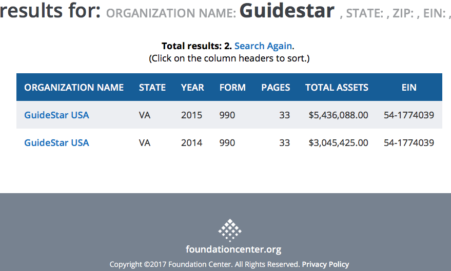 Six Posts (at least) in the Pipeline Pre-Thanksgiving 2017, Yet I See I’d Outlined the Same Basics One Year Ago (Nov. 2016) [Published 11/21/2017]. » Guidestar @990finder | NAMEsearch= only thru FY2015 (Img#1) but by EIN# 541774039 (Img#2)= thru FY2016 -w name blooper (Guide_Star) label (Sshot 2017Nov19 Sat @5.49.30 PM