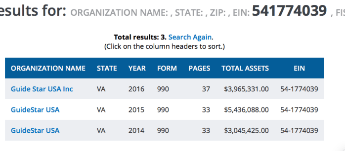 Six Posts (at least) in the Pipeline Pre-Thanksgiving 2017, Yet I See I’d Outlined the Same Basics One Year Ago (Nov. 2016) [Published 11/21/2017]. » Guidestar @990finder | NAMEsearch= only thru FY2015 (Img#1) but by EIN# 541774039 (Img#2)= thru FY2016 -w name blooper (Guide_Star) label (Sshot 2017Nov19 Sat @5.50.19 PM