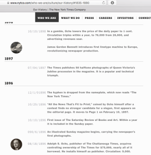 The earlier NYTCompany history can be looked up (I just did. Timeline not that smooth reading and interspersed with famous world events, but I did learn that it predates (as “The New-York Daily Times”): The Civil War (and was the sole recipient of official government news for that war), the invention of both the typewriter and the telephone, and (by just a few years, and with one of its founders on a director) the AP (Associated Press) (1951, 1956, respectively).