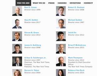 I also learned that Adolph S. Ochs of Chatanooga, TN, obtained control of the company in 1896, and that when he died in 1933, control passed to his son-in-law, Sulzberger (so now you know where that hyphenated name comes from…). I also see that their present board of directors has: few from before the 21st century; and only two women (and, judging by the appearances only) not one person of color: