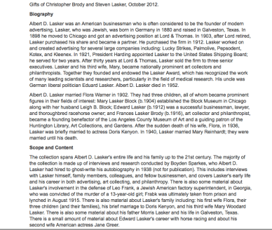 Albert D. Lasker Papers MSS descr. found at OnlineArchiveCalifornia, as held at Huntington Library in San Marino Calif. More bio details and relatives named; noticed date of acquisition and source. Click image to enlarge.