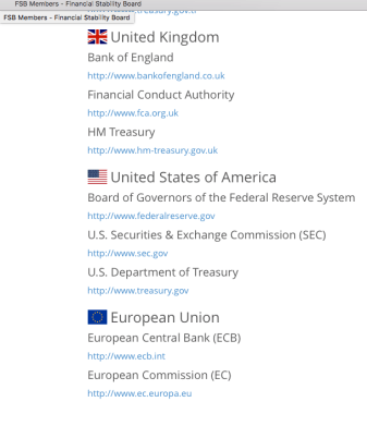 #5/11: “FSB Members UK, USA, and EU with corresponding “national authorities” involved. For the USA: <1>”The Fed” (Federal Reserve System) Board of Governors, the <2>SEC Commission, and <3>the U.S. Treasury. For the UK, one bank and one Financial Conduct Authority. For the EU, one bank, and “The European Commission.” …(Obviously just some of the many FSB members).