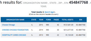 And here are the later last three year’s tax returns for 501©3 “Choose Chicago” (with that as part of the legal business entity name), and those aren’t “Foundation Center” name screw-ups but apparently entity name changes..