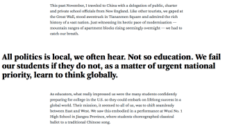 Educational leaders in the Boston metropolitan area can be proud this academic year. With pupils in Boston Public Schools hailing from more than 100 countries and the fastest growing foreign student population in higher education in the nation, few places in the country match the diversity of our student body, from pre-K to post-grad. But the growing internationalization of our classrooms and communities is not reflected in the public school curriculum. And the Common Core, adopted by Massachusetts in 2010, offers no indication that this will change.