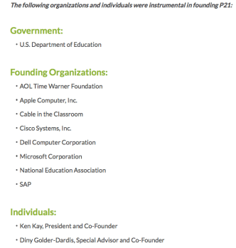 Some labeling issues in this part of P21 founders. Government is included under “organizations” and “Orgs” includes mix of for-profit (more frequently called “businesses” or “corporations”) and a tax-exempt foundation (named after a major business), and just for good measure, the NEA (a major professional association) and one (“SAP”) they simply didn’t bother to identify. [It’s based in Germany, since the 1970s, and is huge.  See timeline!]] Some on the list have an “Inc.” but most do not. Good grief — these people want to prepare students?? // Needless to say, the website doesn’t feature its own financials, or EIN# as a nonprofit and its basic presentation regarding itself is sketchy.