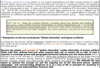 However, any fair or meaningful use of language implies that, by comparison “global citizenship” unless a meaningless metaphor or badly-constructed phrase, implies a supreme or sovereign (if citizenship is to be coerced, either hard-coercion, or soft-coercion over time as I’ve been documenting) over ALL nation states — because for most of us, it is humanly impossible to leave “the globe,” although it might be possible and obviously is for people to become refugees, migrate, immigrate, emigrate and LEAVE one state to enter another, with questions of legally or illegally involved in the movement.