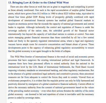 This Wild West frontier of international finance is the result of social and economic power processes that have outgrown the existing international political and legal framework. In response there have been piecemeal efforts to extend authority from the national to the international level by the G20, Bank of International Settlements, the Third Basel Accord imposing voluntary standards on international banking, and other regulatory mechanisms. But in the absence of a global centralized legal authority and constitutive process, these piecemeal measures are far from adequate to control the forces they seek to contain. Viewed from an evolutionary perspective, it is evident that the requisite power can only be fully harnessed and positively directed by emergence of a global constitutive financial authority. Current efforts to derive the necessary authority from the consent of national governments based on the values of the prevailing market economy − even when their actions threaten the stability of the entire global economy – are doomed to fail and repetition of crises is inevitable until the necessary power is ceded by sovereign states.