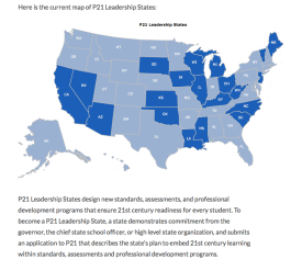 A list of “P21” Model states (Interactive on website, not here, dark blue = those states), where “P21” is “Partnership for 21st Century Learning (formerly “Skills”), a D.C. nonprofit.”
