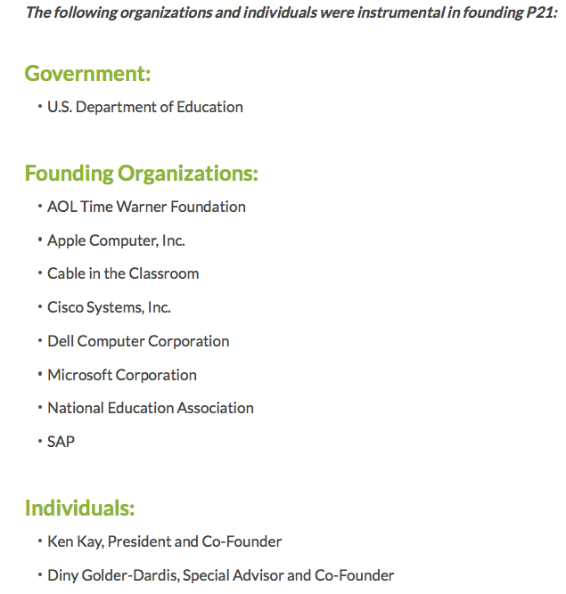 Some labeling issues in this part of P21 founders. Government is included under “organizations” and “Orgs” includes mix of for-profit (more frequently called “businesses” or “corporations”) and a tax-exempt foundation (named after a major business), and just for good measure, the NEA (a major professional association) and one they simply didn’t bother to identify. Some on the list have an “Inc.” but most do not. Good grief — these people want to prepare students?? // Needless to say, the website doesn’t feature its own financials, or EIN# as a nonprofit.