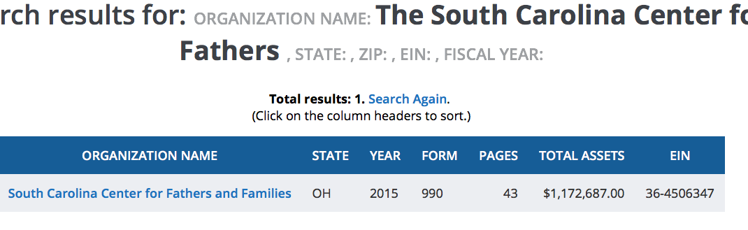 EIN# 364506347 Direct recipient of $8.7M of HHS grants (2006-2017) mostly under health marriage/responsible fatherhood promotion (CFDA 93086, and if not, under Child Support Improvement programs for noncustodial parents, strangely, is run from Ohio (although legal domicile SC), something not reflected in the TAGGS.HHS.Gov database (see this generated link from an Advanced Search run Nov. 28, 2017) which locates it in SC. Regardless of location, what it’s doing is, as a grantmaking organization, funding (currently, and it seems recently) just six fatherhood programs across the state, thus concealing from direct observation of TAGGS without other research, where and on what these tax receipts from the federal “coffers” or at least appropriations, are actually being spent.