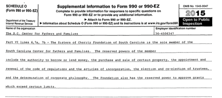 Form 990, Sched O Supplemental Info for SC Center for Fathers & Families (an OH-based entity formed in 2002 and re-distributing HHS grants to six fatherhood programs throughout SC, with leadership paid by its related entities in the religious health system. Sole member is as shown below — another foundation..