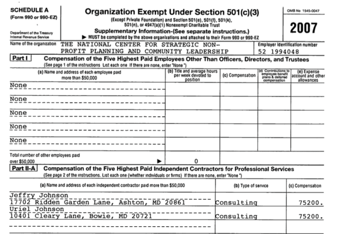 EIN#521994048 (dba “NCPL”) tax return excerpts and an IRS “EOS” result showing instantaneous revocation/reinstatement May 2013.