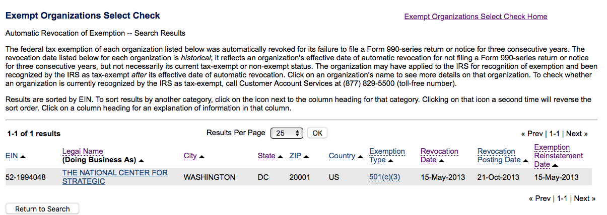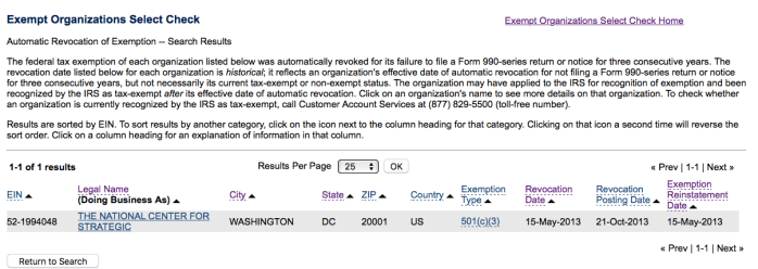 EIN#521994048 (dba “NCPL”) tax return excerpts and an IRS “EOS” result showing instantaneous revocation/reinstatement May 2013.
