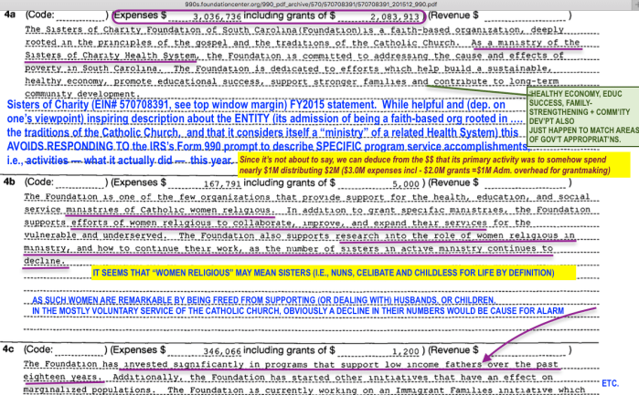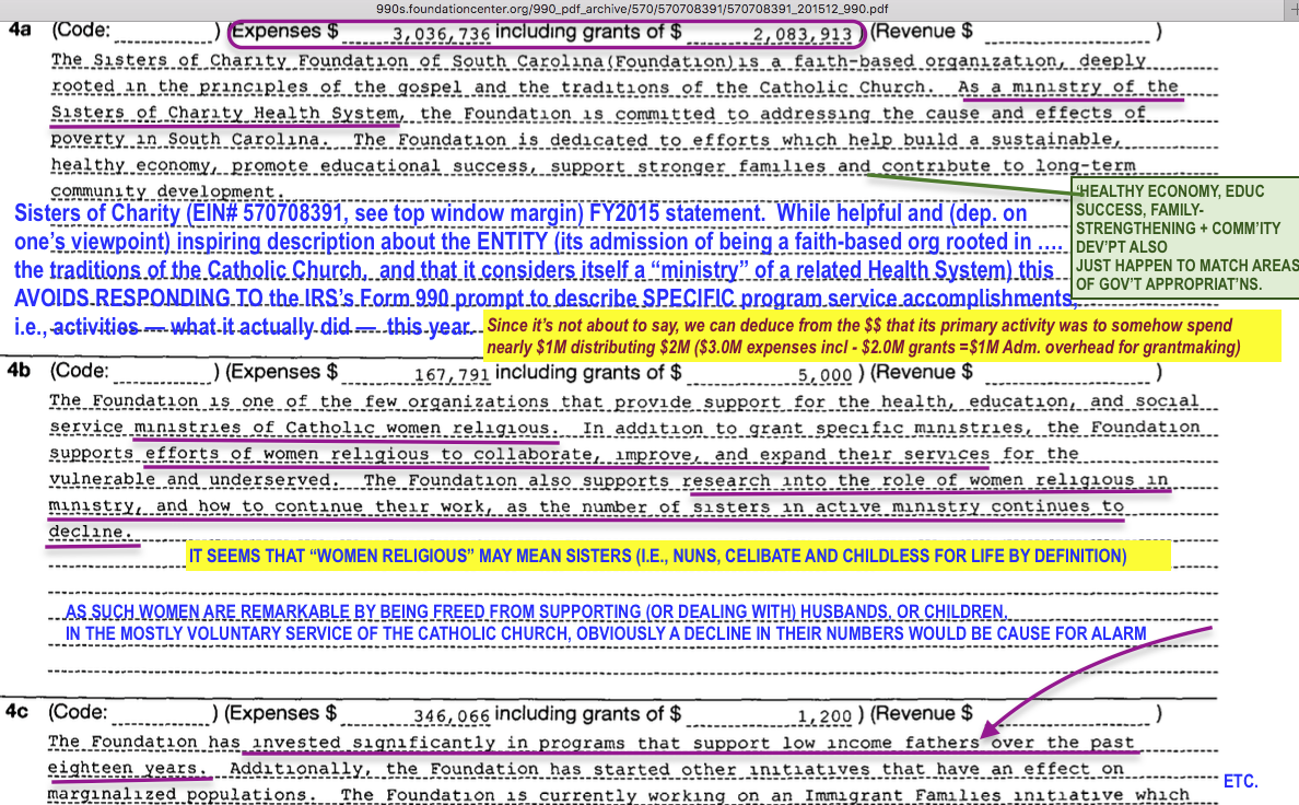 Why are Famous PRIVATE Foundations (Ford, Mott, Public Welfare) and Collection Agencies (JustGive.org) so enamored of Funky 501©3 Filers — like Wisconsin’s barely still there CFFPP (Center for Families and Public Policy) and Board of 1hr/week Unpaid Father-Focused Networks (some entities, some not) Speakers, Conference-circuit Experts? » Sisters of Charity Fndtn of SC (EIN#570708391, FY2015 Pt III descripx) Viewed 2017Nov28 Tue @ 1.10PM