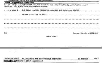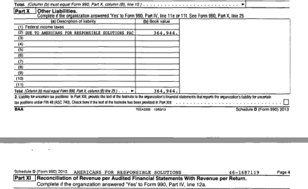 | AMERICANS FOR RESPONSIBLE SOLUTIONS[This one was “Assets liquidated” FY2014 in favor of another one with common leadership by the same name (per Sched-N attached). Click this tax return to see or some of the images below. | DC | 2014 | 990O | 29 | $0.00 | 46-1687119 |