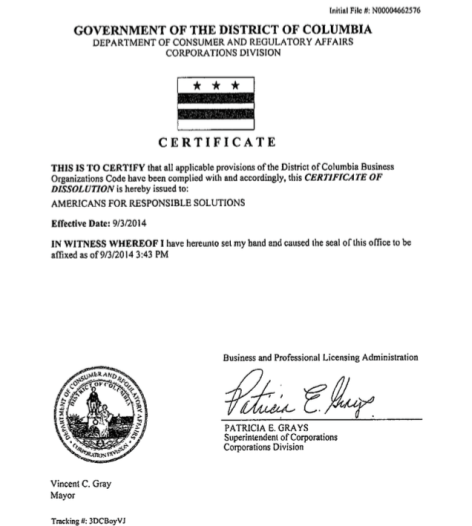 Image #4 of 4, ARS (Americns for Resp Solutns EIN#46-1687119 (flash-in-the-pan | Terminat’n FY2014 (short yr) after JUST 1 yr in effect)** Certificate of permission to dissolve from D.C. attached