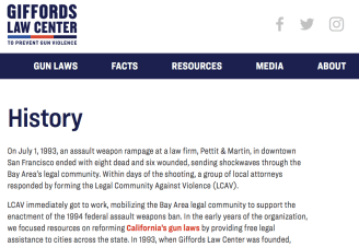 Screenprints of self-description from, or (#4/4) linked to: http://lawcenter.giffords.org/ about/history/ (without annotation, although I have one caption):