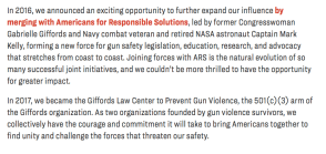In 2017, we became (HOW? Name change, merger, or yet another dba? The link doesn’t say) the Giffords Law Center to Prevent Gun Violence, the 501(c)(3) arm of the Giffords organization.** As two organizations founded by gun violence survivors, we collectively have the courage and commitment it will take to bring Americans together to find unity and challenge the forces that threaten our safety.