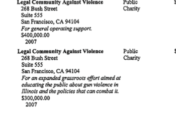 The related entity (not acknowledged or even identified on the NRA on the Record website) was started, say its returns, back in 1978) and is a 501©3 EFSGV — Education Fund to Stop Gun Violence. Both are based in DC. They are backed, it turns out, by the Joyce Foundation among others which doesn’t seem to be acknowledged on either entity’s website but is on the Joyce Foundation’s.