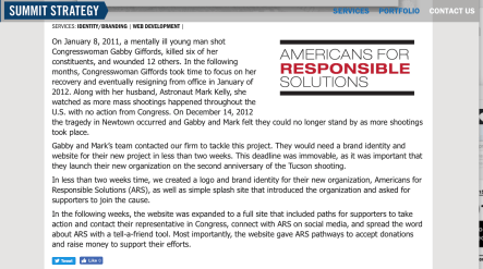 The next PR firm (presumably) “Summit Strategy” wasn’t mentioned on that Form 990, however here’s an image from its own website boasting about how fast it got ARS name up and running, and able to take donations. This image comes after a sample (not copied here) website, and represents a firm advertising its well-known clients, of course: http://summitstrategy.com/work/americans-for-responsible-solutions/. it also indicates that the Giffords didn’t decided to incorporate and get involved in this way until after the (Sandy Hook elementary School) “Newtown” (Connecticut) mass shooting. They were disappointed US Congress hadn’t done more (i.e., federal government) but have become active, and it seems, successful more at the state levels. Reminds me of a tactic used (successfully) by the anti-smoking lobby. Just FYI: