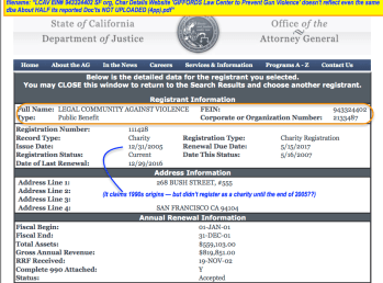 2 of 4, Giffords Law Center. Again, “for the record,” Calif. SOS doesn’t show an incorporation before 1999 for “LCAV” (which “Giffords Law Center” appears to be), and Calif. OAG Charitable Details while showing YEARS of earlier activity before it finally registered as a charity (making that unregistered activity, as I understand it, illegal), failed to upload anything before FY2008. (See link to charitable details provided earlier in this post).