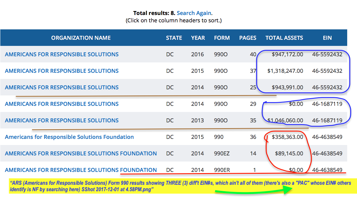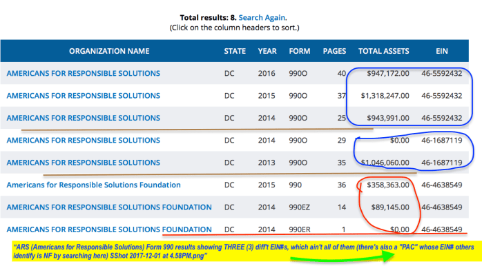 NRA (not) On the Record | Modeling Gun Control/Gun Violence Prevention Laws after Domestic Violence Prevention Laws [i.e., Moving It Under the Mental Health Umbrella], Strategized through Unregistered “Consortia” or Misleadingly-labeled Nonprofits East (D.C.) and West (S.F.)? No Thanks!! [Started Nov. 4, Publ. Dec. 3, 2017] » ARS (Americans for Responsible Solutions) Form 990 results showing THREE (3) diff’t EIN#s, which ain’t all of them (there’s also a PAC whose EIN# others identify is NF by searching
