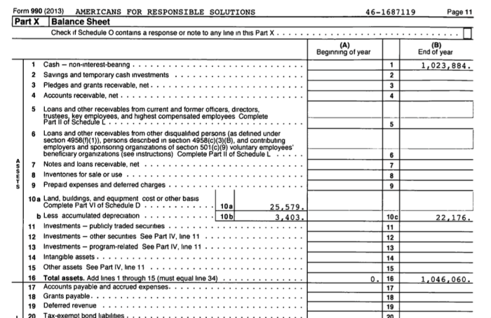 BALANCE SHEET (Assets) showing “0” beginning of the year (but we know $4.3M was contributed) and $1M at Year-end