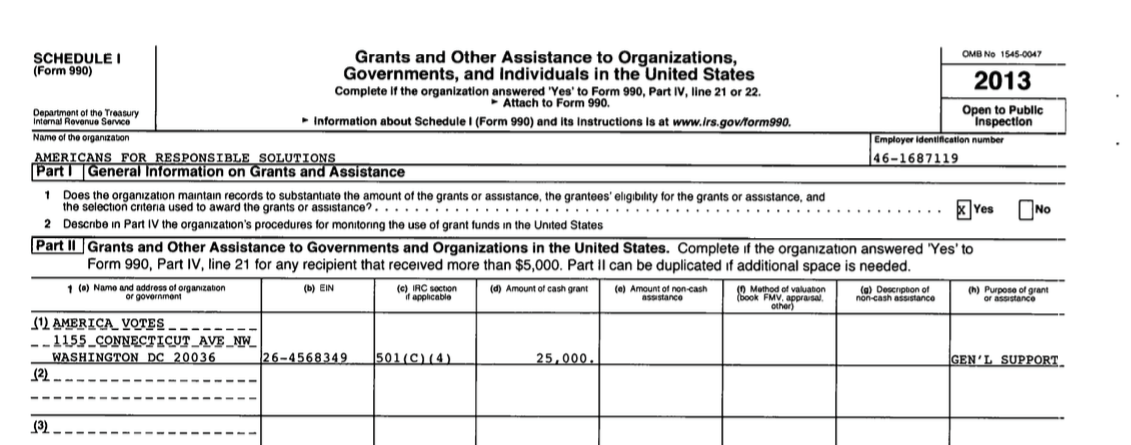 #9 of 12, a minor grant, $25K only — already in debt to a related entity, looks like — ARS EIN#46-1687119 (flash-in-the-pan 2013-2014 only) in 12 images from FY2013**