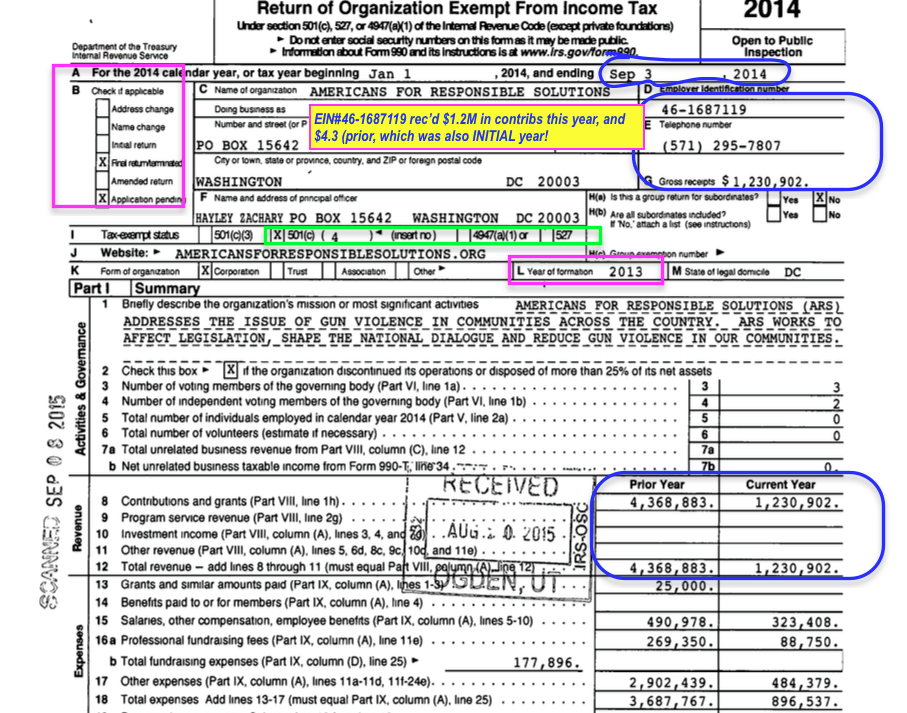 Image #1 of 4, ARS (Americns for Resp Solutns EIN#46-1687119 (flash-in-the-pan | Terminat’n FY2014 (short yr) after JUST 1 yr in effect)** Page 1, Header + Summary (top)