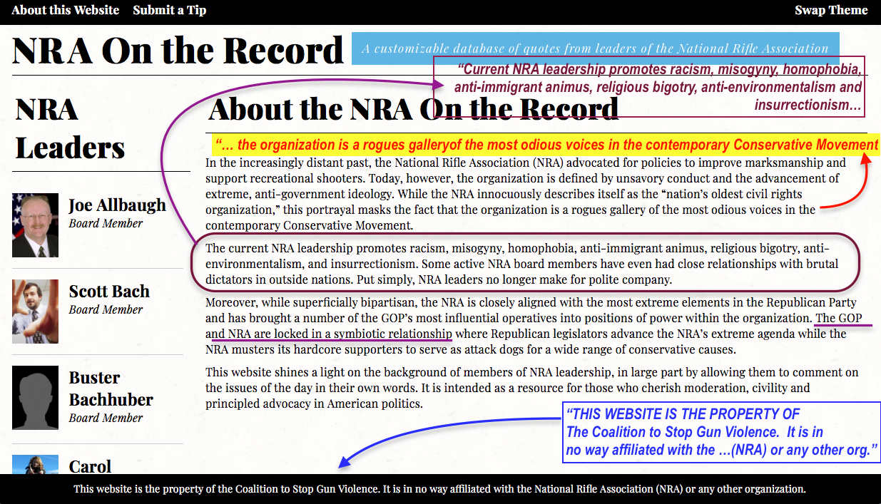 NRA on the Record website (about) with callouts, and calling attent’n to the footer reference to CSGV. Language references the GOP and Republicans, and the Conservative Movement party as (involved with) this “odious” and “rogues gallery” organization throughout just a few paragraphs, but avoids mentioning the word “Democrat” or “progressive” anywhere. Instead, it’s them Republican Conservatives and haters against… (see last sentence) the better members of the American public…