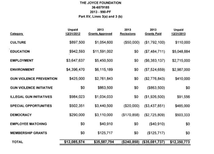 Joyce Foundation (Chicago) ($0.9B assets) “About” and 990PF grants excerpts from various yrs (2015, 2013, 2008) of Gun Violence Prevention Grants incl. to some orgs. discussed in this post. (8 images)