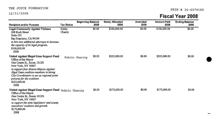 Joyce Foundation (Chicago) ($0.9B assets) “About” and 990PF grants excerpts from various yrs (2015, 2013, 2008) of Gun Violence Prevention Grants incl. to some orgs. discussed in this post. (8 images)