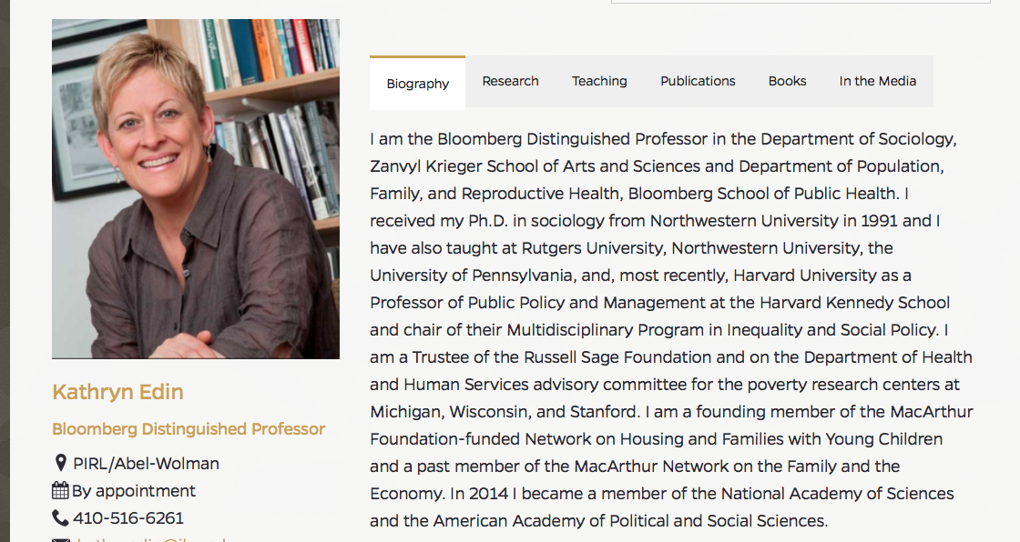 Read the current Johns Hopkins bio blurb under its School of Sociology and Edin’s related C.V. (excerpts posted nearby; she is co-authoring with Ronald Mincy and others on fatherhood issues throughout the post-PhD career and recently was honored by the NFLG (National Fatherhood Leaders Group which is a badly-behaving nonprofit whose leadership entails some of the HHS grantee organizations profiting from those income streams since PRWORA 1996…). My point is not to say this person isn’t a good scholar, or hasn’t earned the academics. However, I find it odd that while she was getting her PhD in one field, I was dealing with an abusive spouse (same timeframe) intent on driving me out of the equally (in its benefits to children, families and society) profession, and through the collaborations denigrating single mothers (such as I later became by virtue of demanding the battering stop and separating myself from the man so attached to the habit, along with other classic, controlling, woman-denigrating, and economically coercive traits that characterized our time together as “man and wife.” It doesn’t seem right within a society that some professions are exalted because they are better for controlling and manipulating poor people (and running studies on them for fame and profit) while the professions some of those are working in, are dishonored. I also protest that there’s no comparable transparency from the same sector on the reality that these professions are sustained by, generally speaking, the poor (when it comes to public funds) and/or private foundations for which the working poor and middle class, are likely working, and via tax differences, not keeping as much of their earnings as the tax-exempt foundations which help preserve historic and family wealth under PRIVATE control..