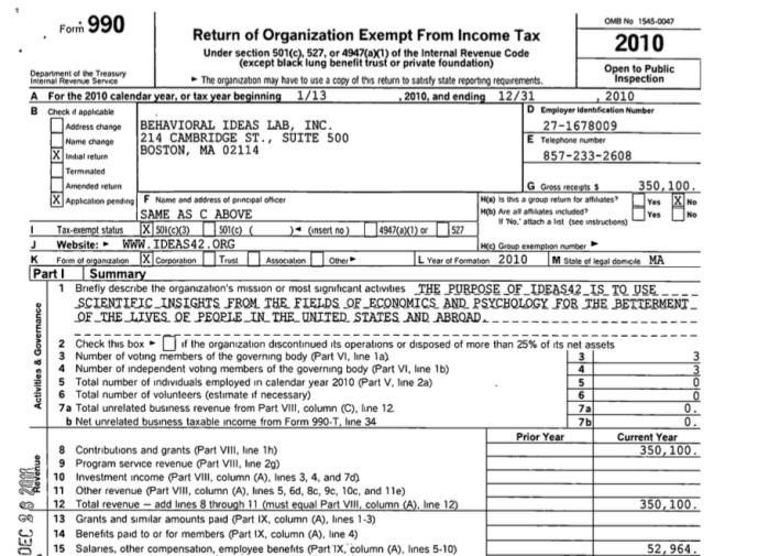 Behavioral Ideas Lab, Inc. FY2010 (YE Dec31) showing only $100 did NOT come from “Foundation and corporate grants.”