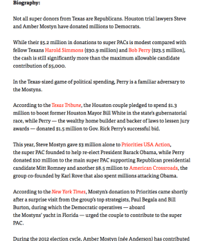 Steve and Amber Mostyn: Two trial lawyers take from the little guy to give to the Left, deep in the heart of Texas (Nov. 3, 2014, by “CRC Staff” but quoting: “By Jonathan M. Hanen, Foundation Watch, November 2014 (PDF to come)”