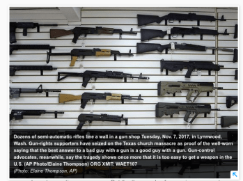 Click image to enlarge for caption as posted in USA Today on-line (Elaine Thompson/AP photo credit). Print version caption: “Last year, the ATF was asked to retrieve more guns sold to disqualified buyer than in any other year in the past decade. The sale of a rifle to one such buyer preceded its use in the Texas church shootings last month.”.