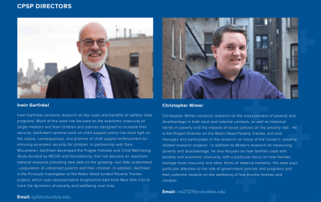 The https://www.povertycenter.columbia.edu website doesn’t have much on it yet. The two directors’ info is in nearly illegible fine print, obscuring (under Garfinkel) his connection to Robin Hood Foundation, which is a separate 501©3 (in NY since 1989). Unlike the staff at this same center, the label “research scientist” with “Christopher Wimer (right) dosn’t have the label “post-doctoral,” yet separately I managed to find a 2007-08 these (doctoral? masters?) at Harvard. (list is alpha by last name putting his description last). I also notice that Garfinkel’s description references “single mothers” but strategically avoids referencing what is literally, it seems, an obsession with: Garfinkel, Mincy (also at Columbia U for years), Garfinklel’s wife Sara McLanahan at Princeton’s (Center for Child Well-being) and that is, fathers, noncustodial fathers, fatherhood, and its relationship to welfare reform, which should continue to give low-income fathers a better break especially on child support. And of course, marriage..