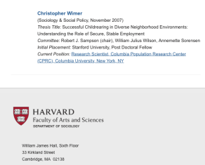 Harvard School of Sociology listing tells me more about Wimer than Columbia, where he’s now working. No reference to Harvard is made at Columbia as no CV is posted…(Note address: “Wm. James Hall…” 🙂