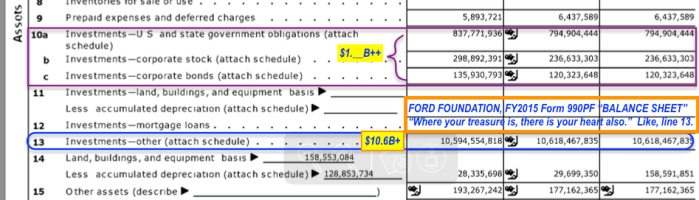 FORD FNDTN (Gross assets FY2015 $12.2B, EIN#13-1684331) shows $10.6B of total $12.2B held in “Investmts – Other” (not shown — $115M in Savings and about $10M in Cash, near top of the same page)