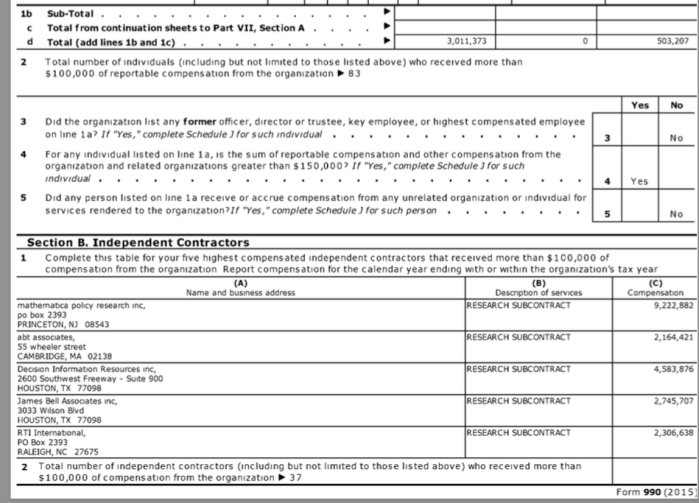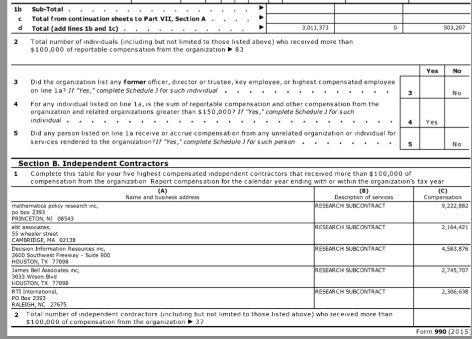 MDRC (Form 990 FY2015) Pt VIIA subtotal shown (details not there, but on “see additional data” table further down in return) + Pt VIIB Top-5 independent Subcontractor names (payees), categories of services and $$ paid.