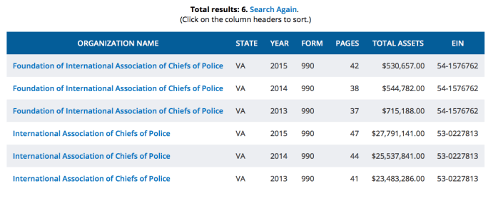 The IACP Foundation (top three rows) helps dependent families of law officers killed in action (formed in 1990) while the larger nonprofit, which is funded by a combination of private contributions, government grants, and program service revenues, and has been around much longer. Its activities are certainly relevant to the article’s discussion of dangers of large amount of disqualified firearms not yet retrieved, or of retrieving them.